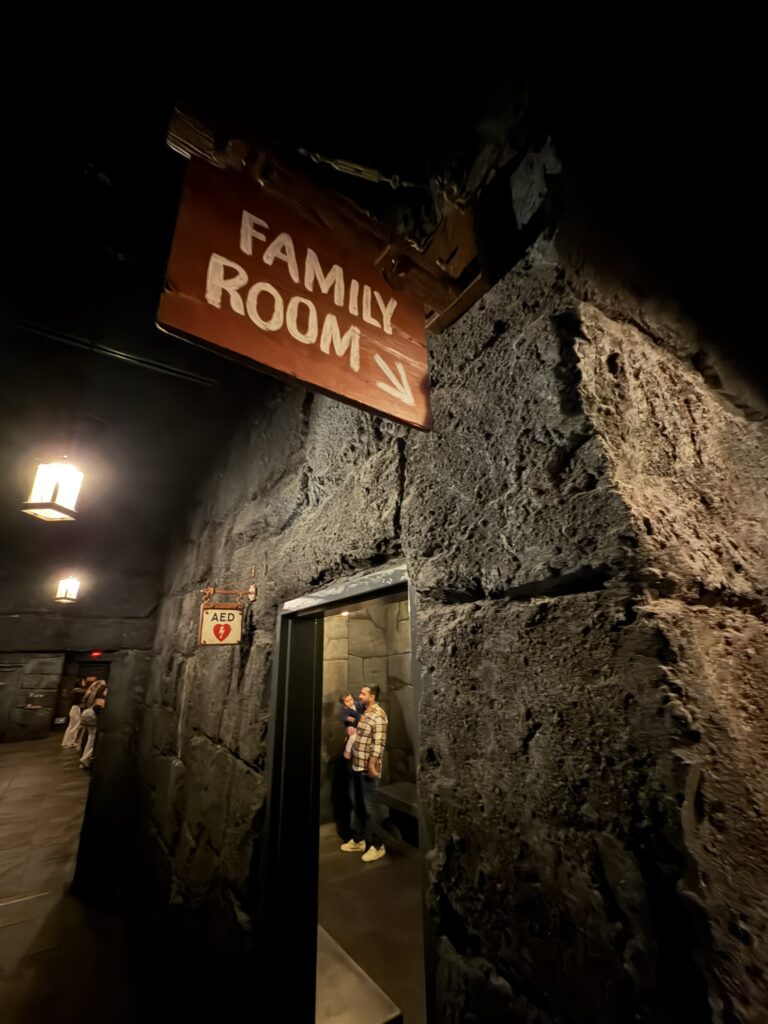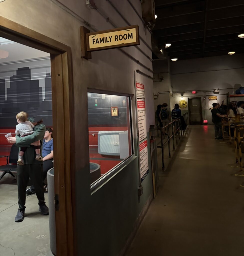 Once here, one of the adults will be guided to a family waiting room with the non-riding child(ren).