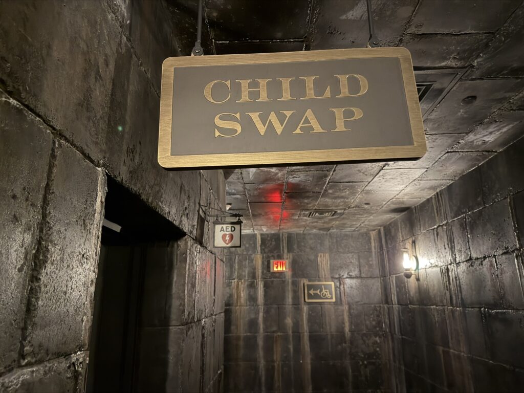 Before getting in line, we let the attendant know we want to use the Child Swap, who informs us that there is a room prior to boarding the coaster.