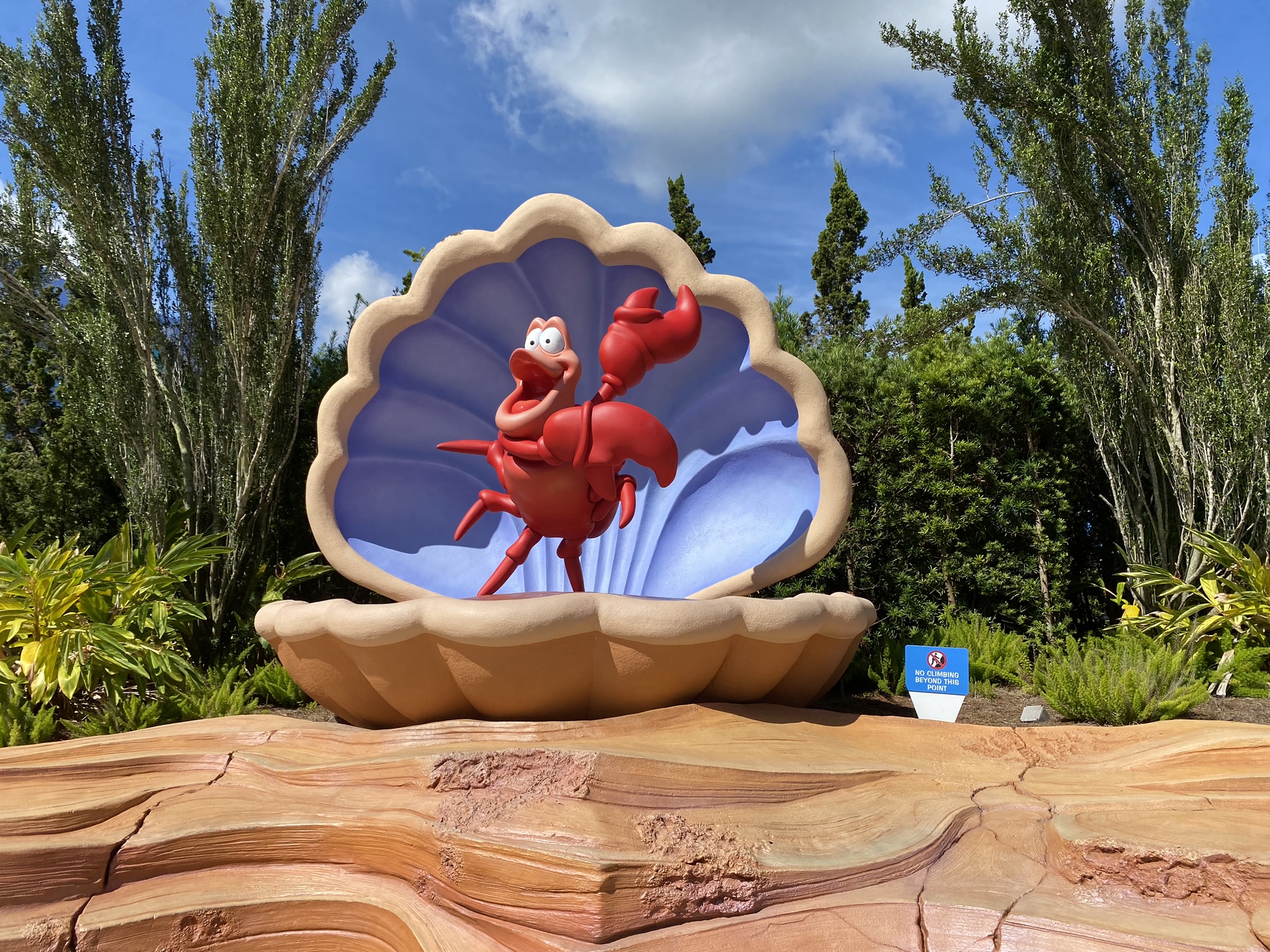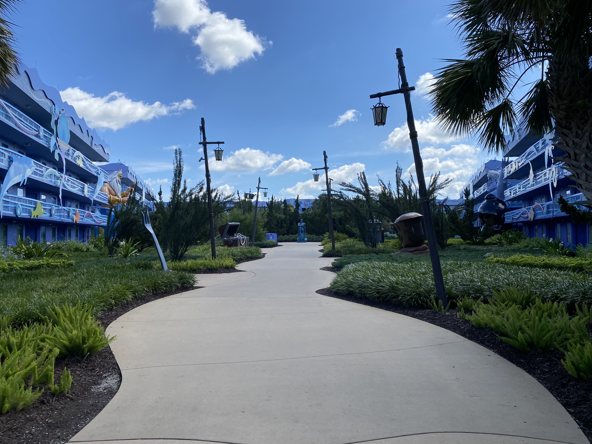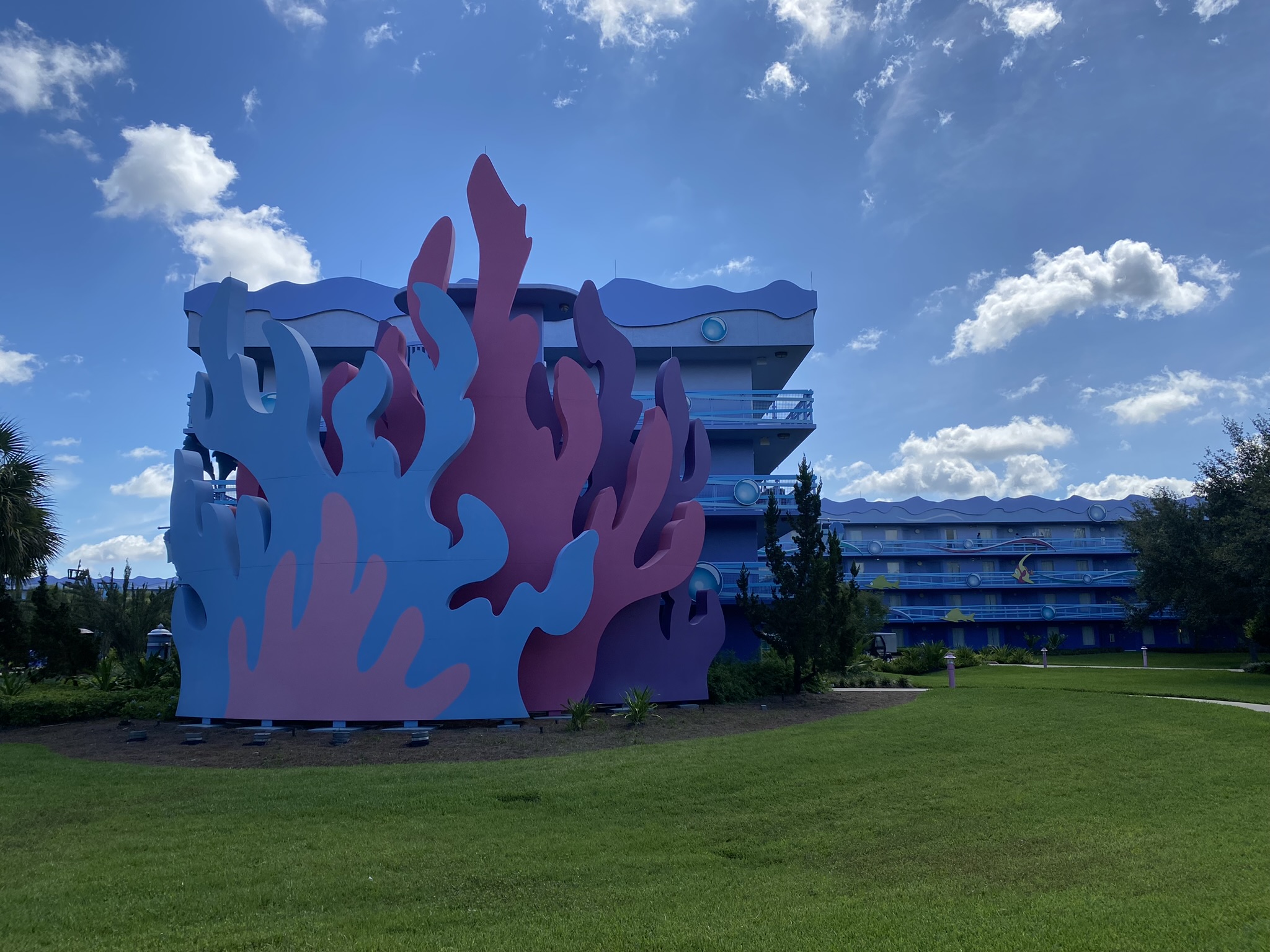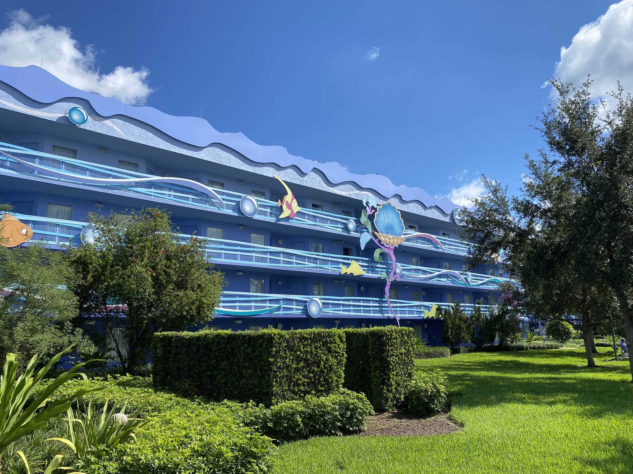 Farthest from the main lobby is The Little Mermaid section, which features standard hotel rooms rather than suites. Ariel, Ursula, King Triton, and Sebastian stand tall in the courtyards, surrounded by seashells, starfish, and under-the-sea details.