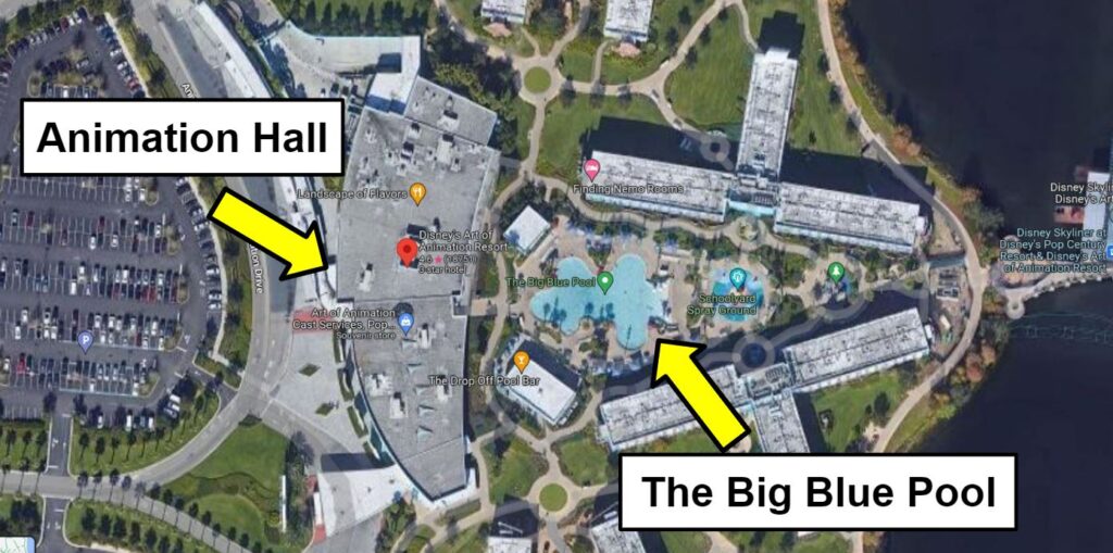 The Big Blue Pool is EASY to find! It is located right behind the resort’s main lobby, Animation Hall.