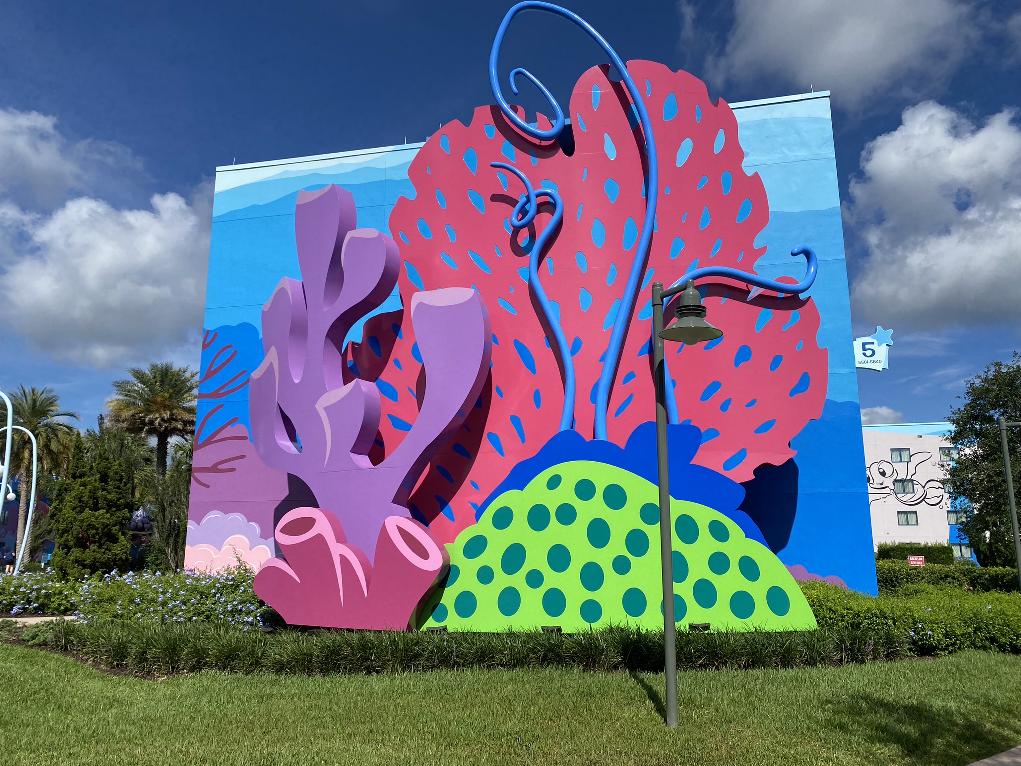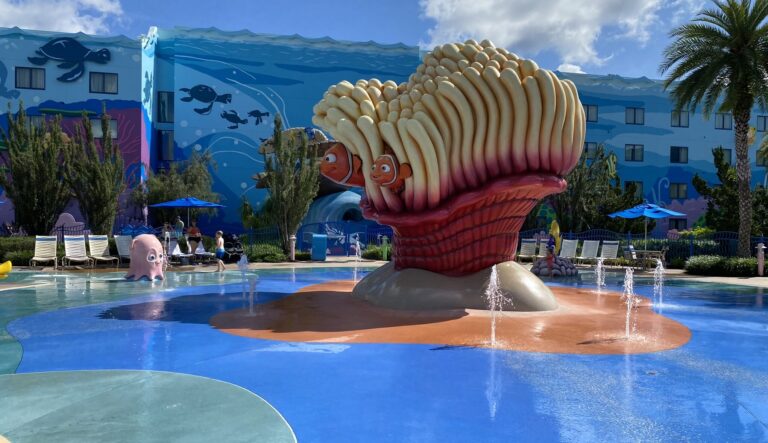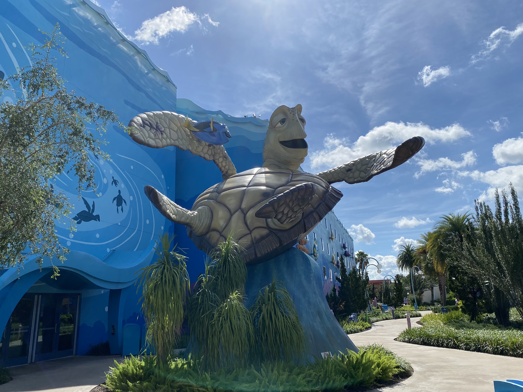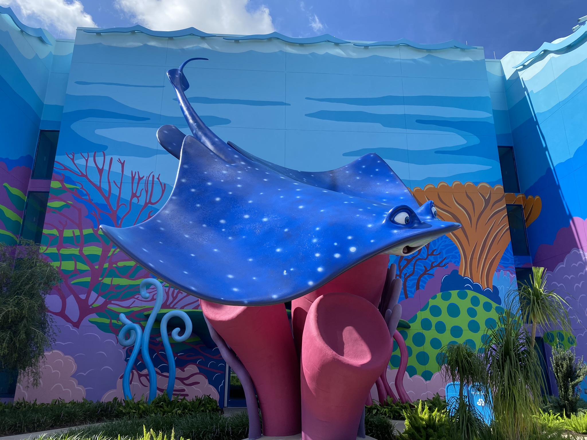 At the center of the resort is the Finding Nemo section, which features the main lobby (Animation Hall), the Landscape of Flavors food court, and the largest pool on Disney property—The Big Blue Pool. Here, you’ll find oversized statues of Crush, Mr. Ray, and a giant jellyfish.