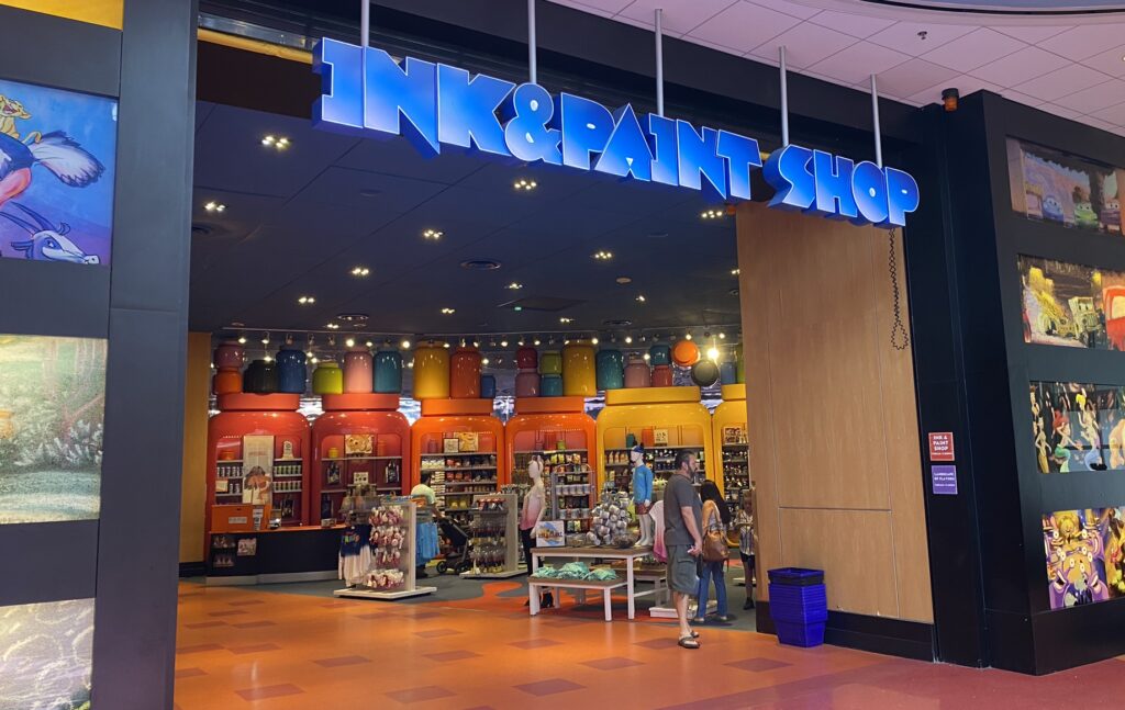 Inside Animation Hall, you will find the Ink & Paint Shop. Here you can shop for various souvenirs, shirts, pins, Mickey ears, sports apparel, character merchandise, snacks, and many other goodies!
