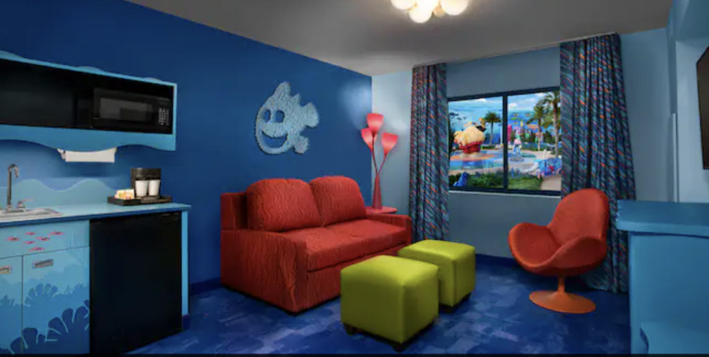 Whether you’re swimming in a Finding Nemo-themed pool, grabbing a bite at the food court, or walking through life-sized sets from The Lion King, Cars, and The Little Mermaid, this resort is bursting with immersive touches that bring the magic to life.