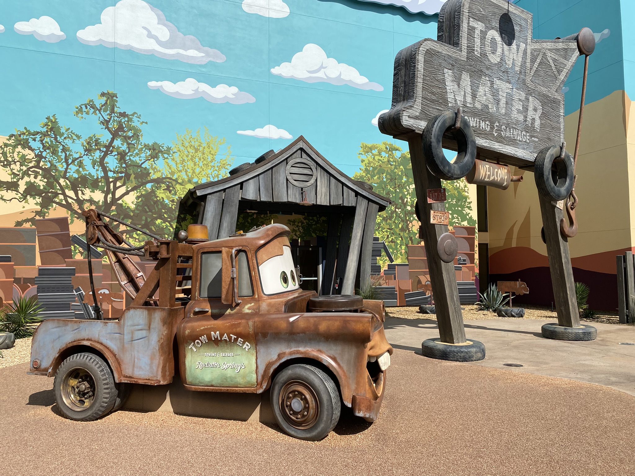 To the right of Nemo is the Cars area, designed to look like Radiator Springs. Life-size models of Lightning McQueen, Mater, and the rest of the crew line the sidewalks, and the buildings are themed like cozy roadside motels.