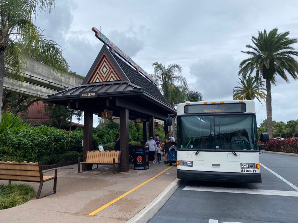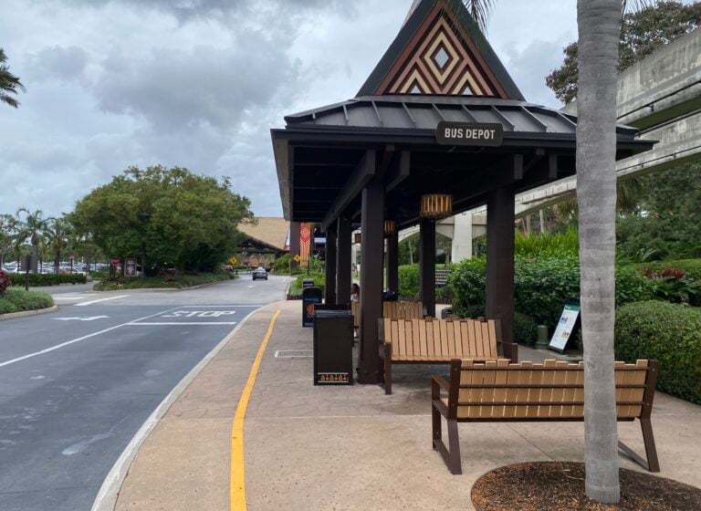 The bus stop is located next to Lilo’s Playhouse Laundry Room. As you can see below, it’s also smaller than the bus stop at most of the other Disney resorts.