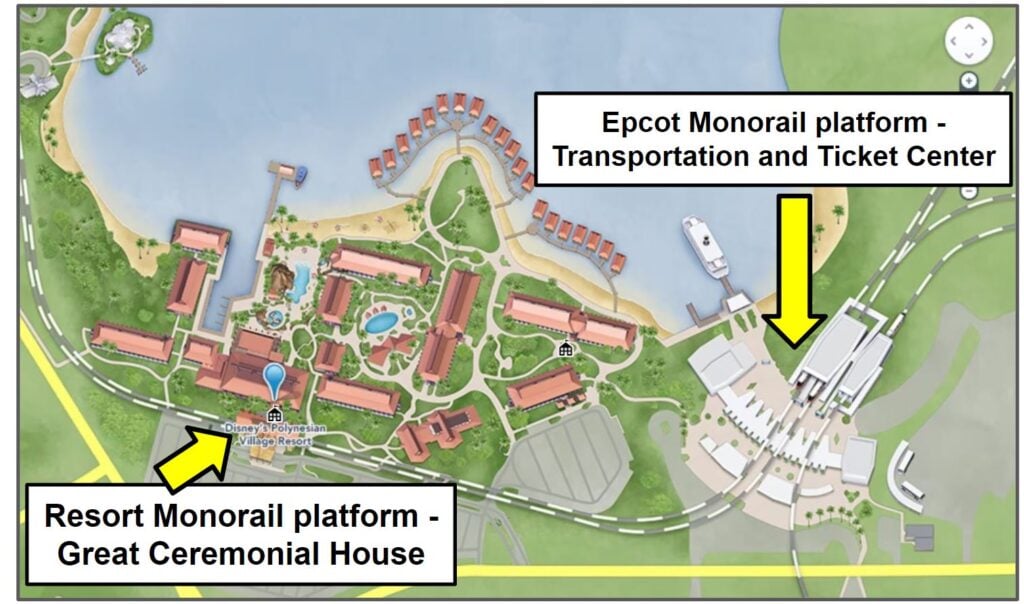 First, I want you to look at the map below of the Polynesian Resort. I labeled the locations of both monorail platforms.