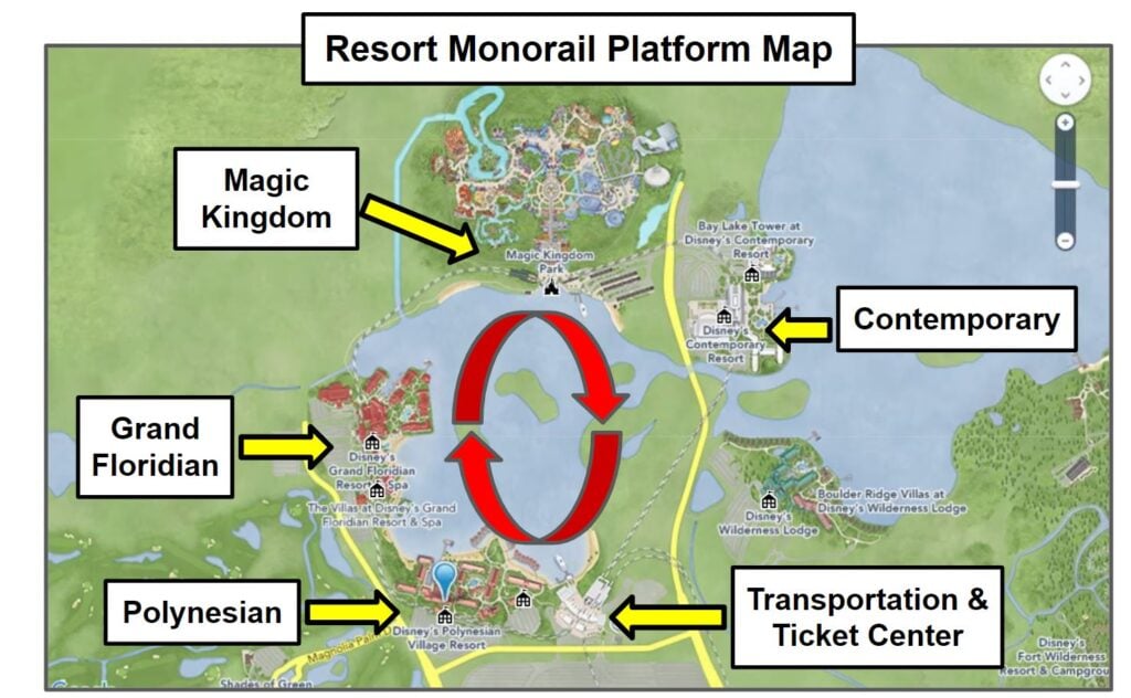 If you stay in either of the buildings circled in red, it’s probably a shorter walk to the TTC than to the Great Ceremonial House. At the TTC, you can quickly board a monorail that goes DIRECTLY to Magic Kingdom, which avoids stopping at the Grand Floridian. This is called the “Express Monorail” since it only goes between Magic Kingdom and the TTC.