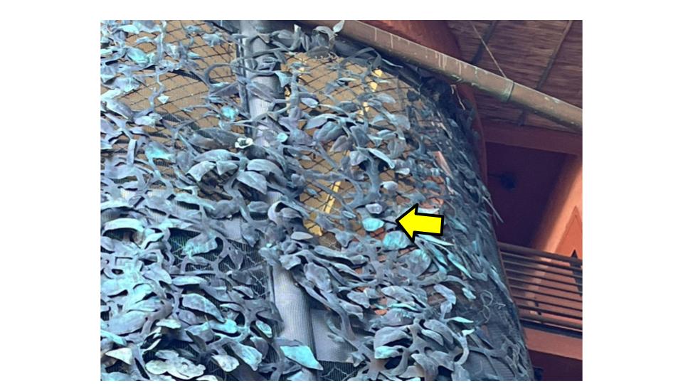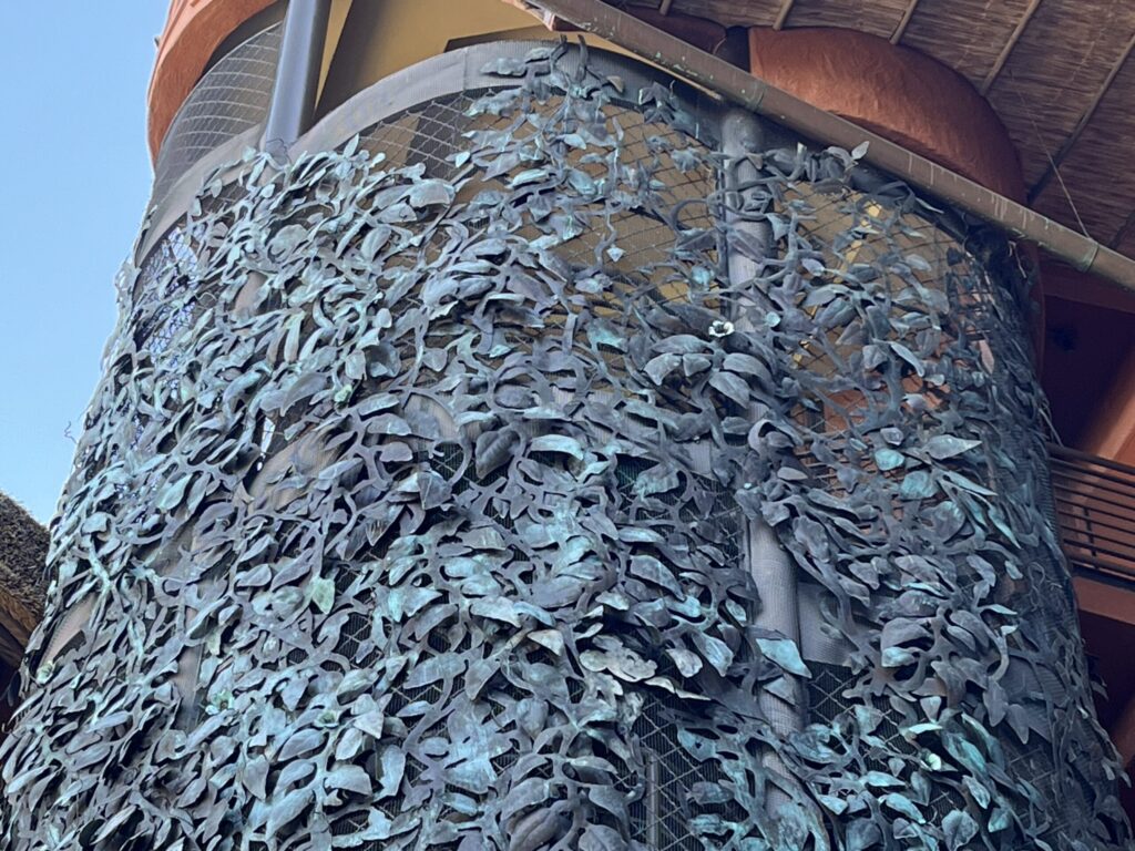 For the next hidden Mickey, take the back staircase and step outside to the back of the resort toward the savanna viewing area. On your way to the overlook, locate a large, vine-covered column. Look about three-fourths of the way up the column to see a hidden Mickey within the vine design.