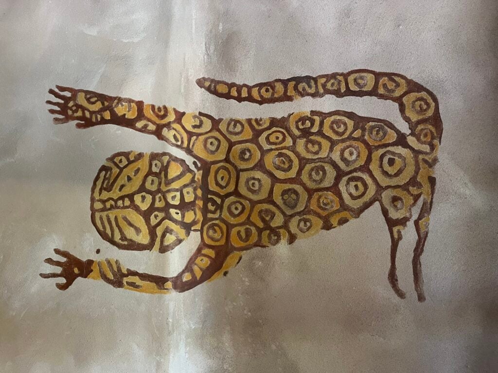 Before stepping inside Jambo House, look at the sidewalk to the right side of the entrance doors and locate the mural with a lizard. If you look closely at the lizard’s back, you’ll see that one of its spots contains a hidden Mickey.