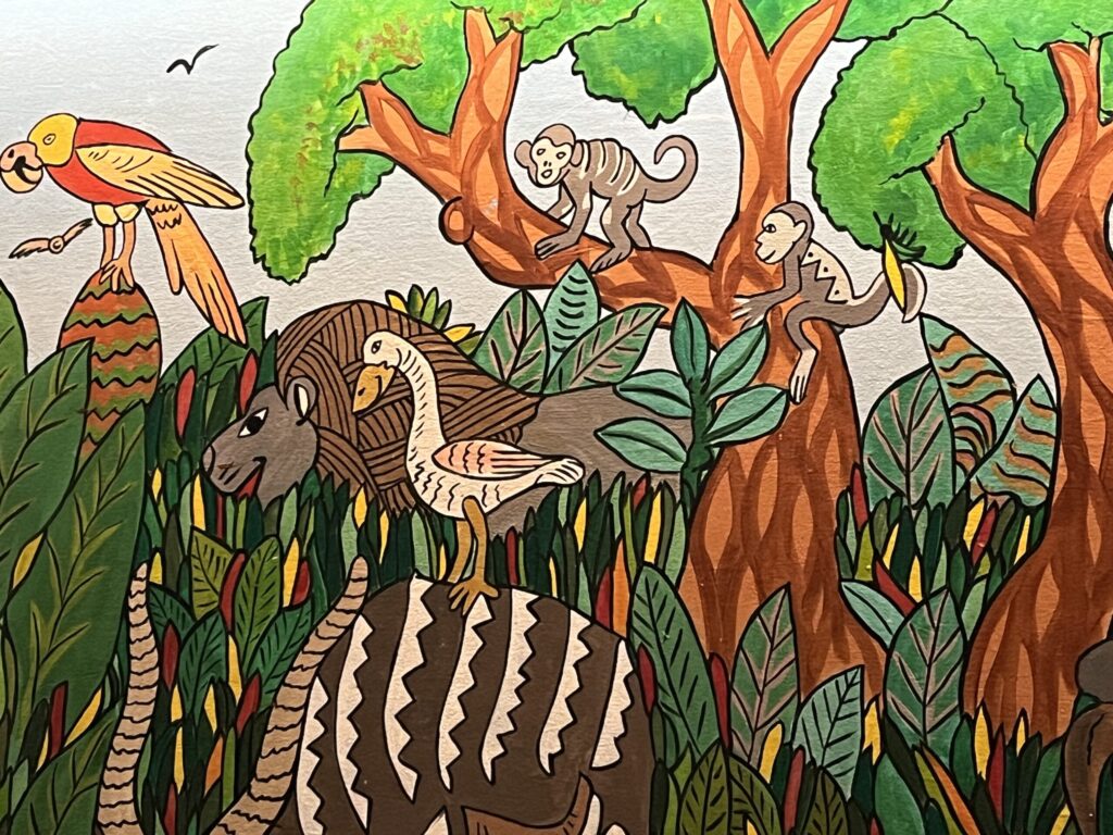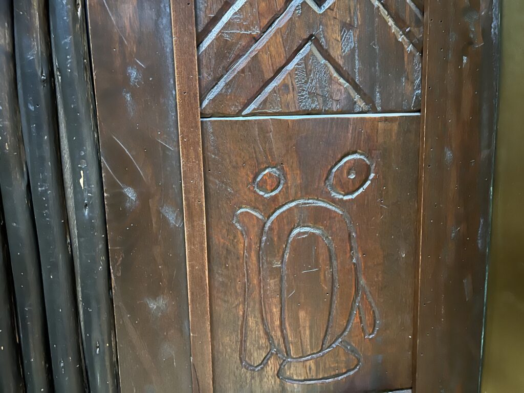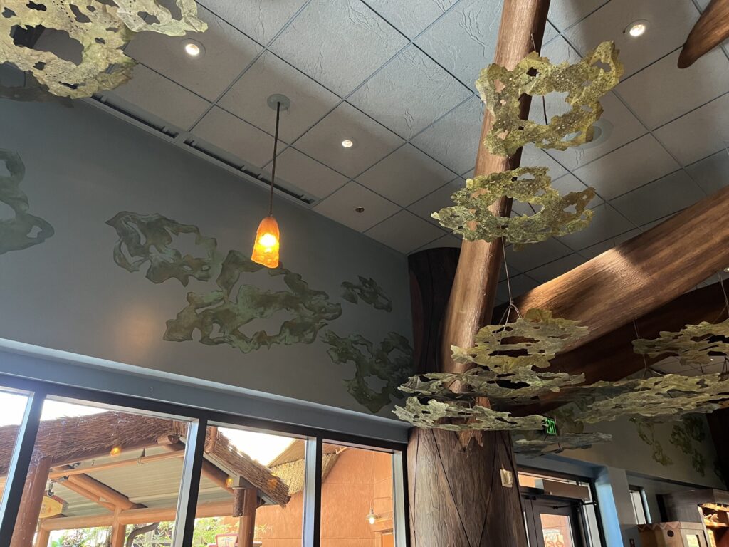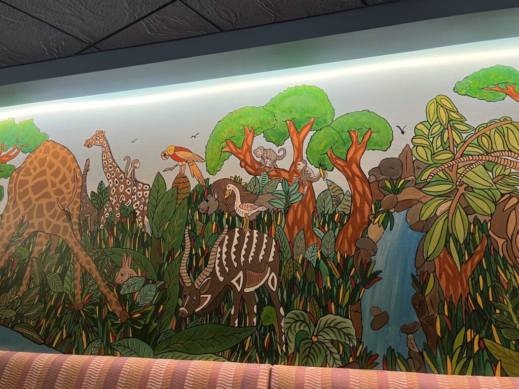 While still in the Mara, go to the back wall mural. There is a monkey climbing a tree in the middle of the mural’s design. Look closely at the monkey on the left side, and you’ll find a hidden Mickey shape on its face.