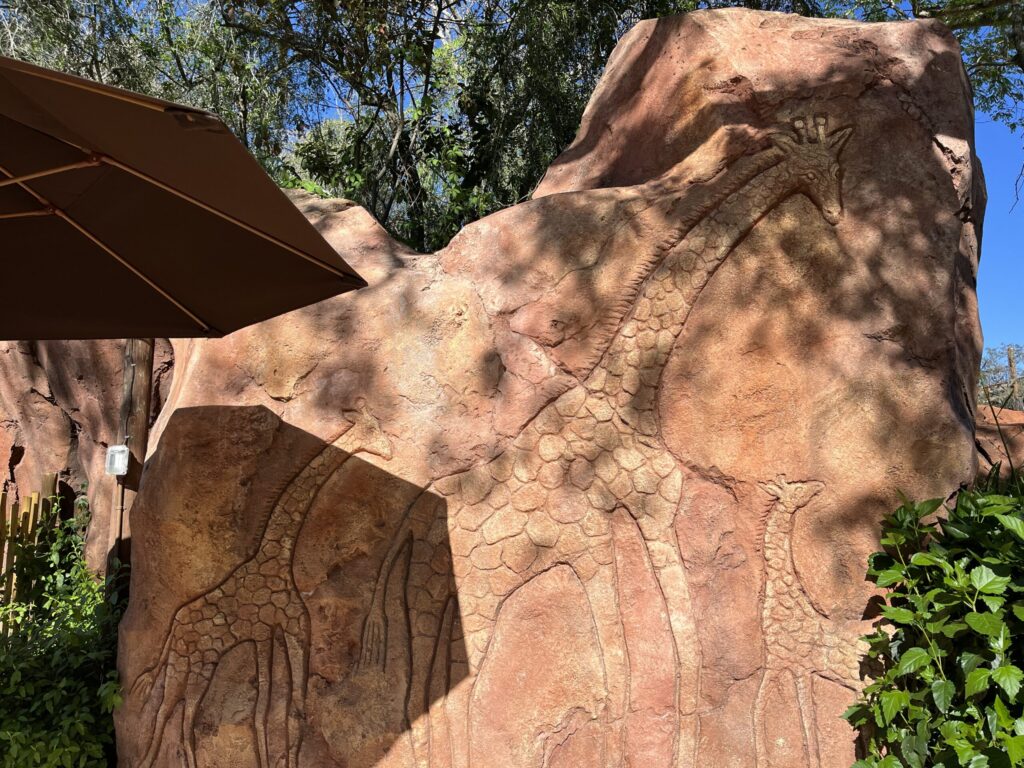 Once you are at the savanna viewing area, look on the left side for a rock design of a mother giraffe and her calf. Three spots on the mother giraffe form this hidden Mickey.
