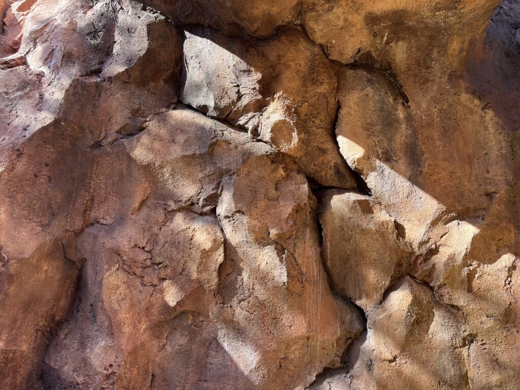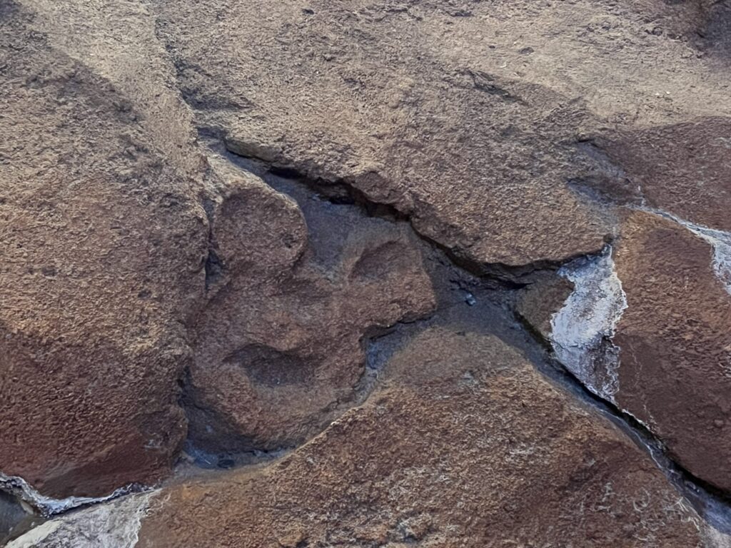 While still in the viewing area, locate the light brown crates between a trash can and a bush beside Arusha Rock and look up. Above the crates, you’ll find this hidden Mickey impressed in the rock.