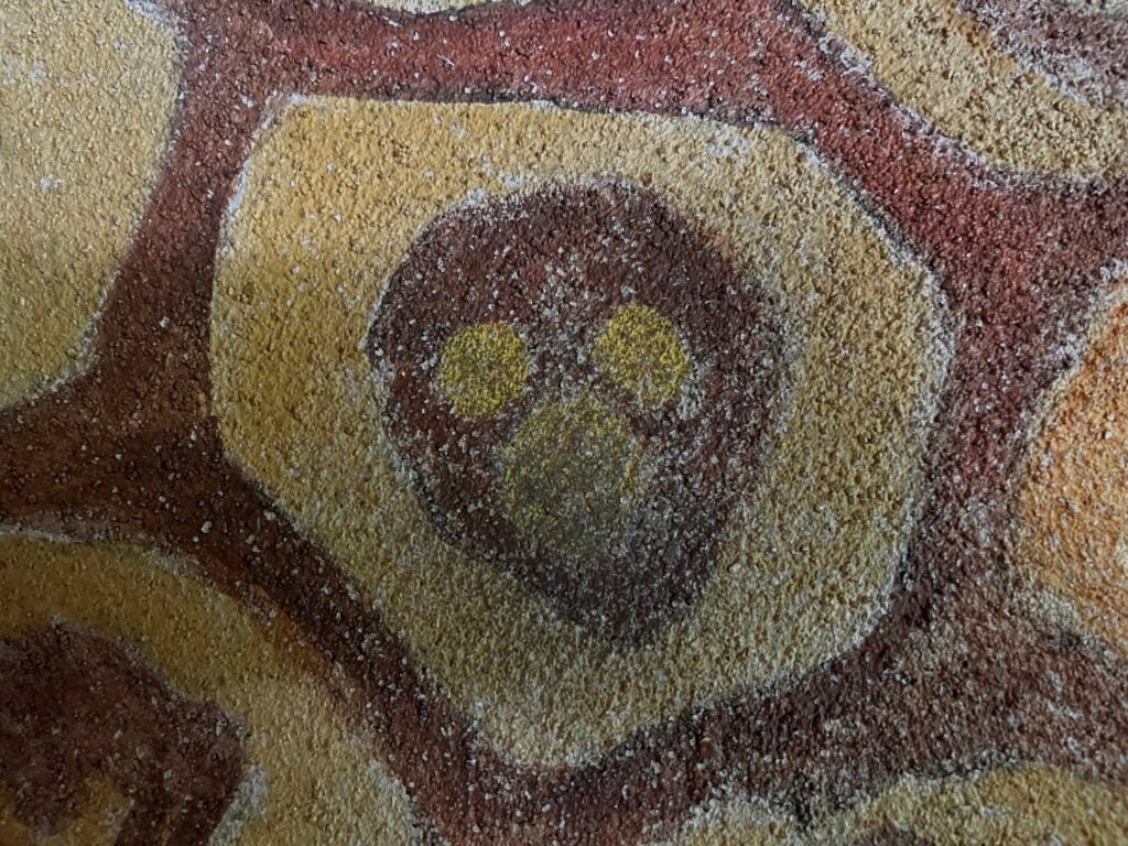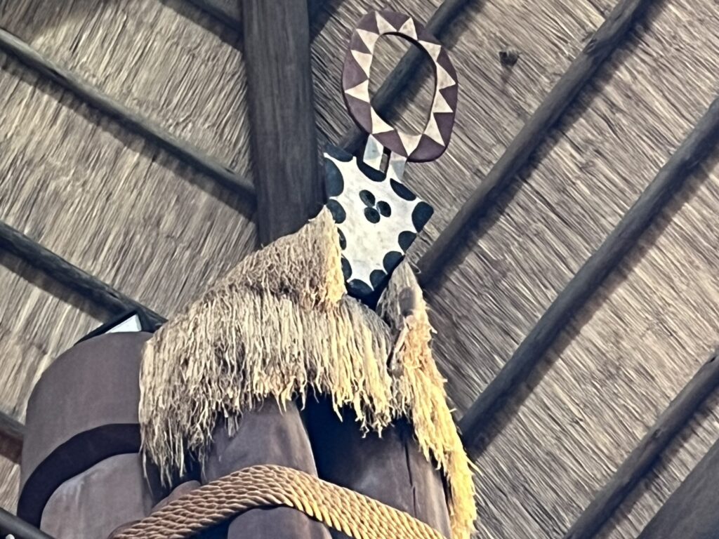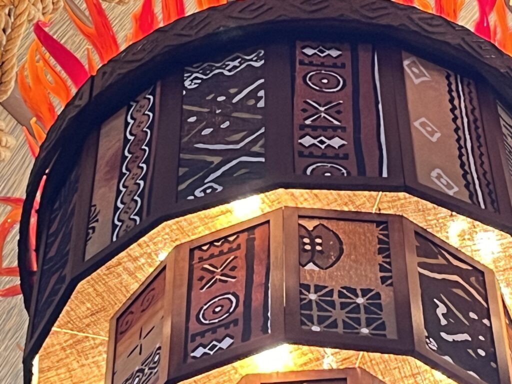 Keep your attention on the columns and look up to the ceiling to see the African-themed shields on display. You’ll see three black dots on one of the shields, forming this hidden Mickey.
