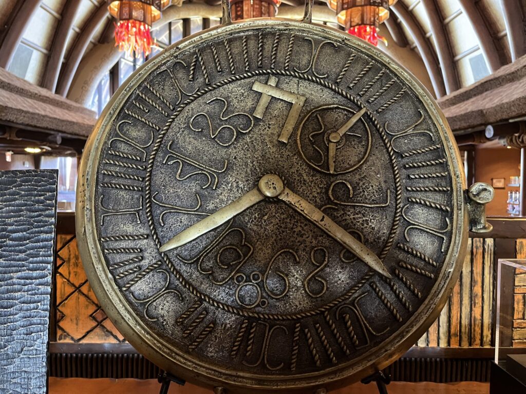 Once you are in the Kidani Village lobby, go to the themed clock on a table. Look closely at the clock between six and seven, and you’ll see a hidden Mickey in the clock’s design.