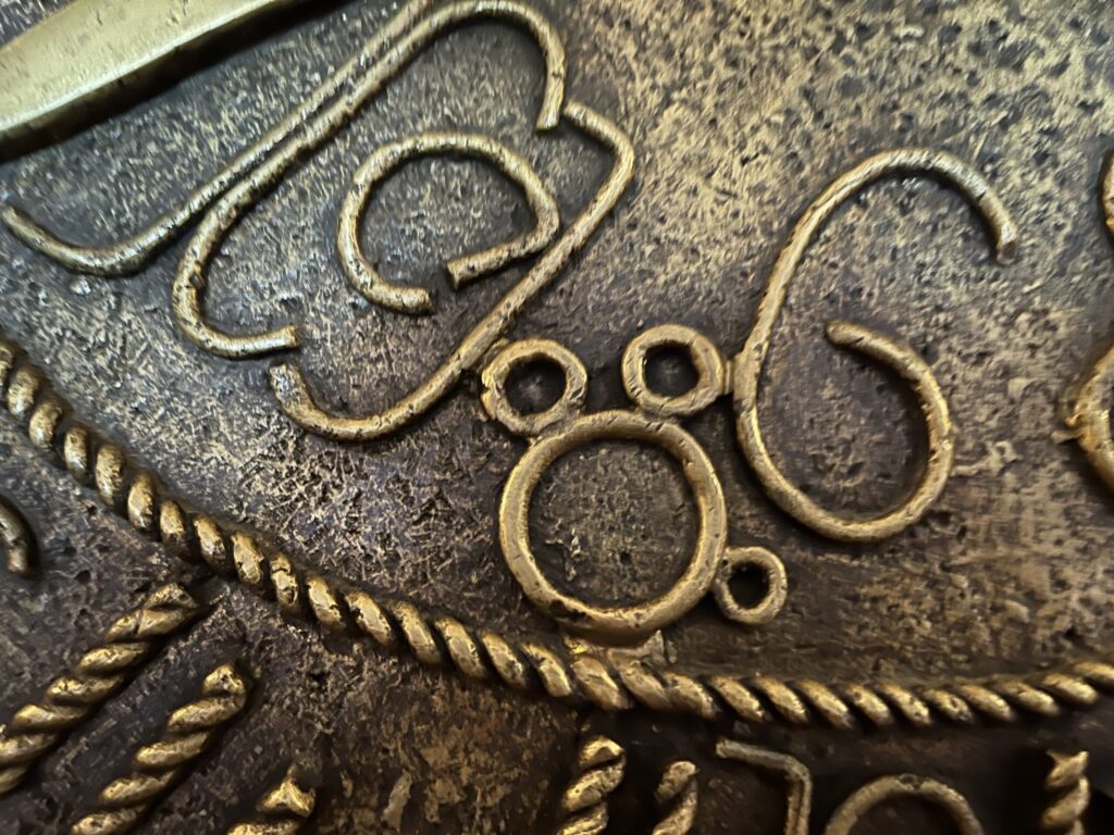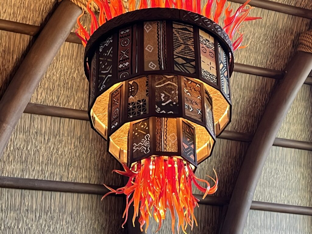 The next hidden Mickey is also located in the Kidani Village lobby. Look up toward the African-themed chandeliers and notice the one in the middle, nearest to the registration desk. On that chandelier’s top tier, you’ll see a hidden Mickey within the design of dots.