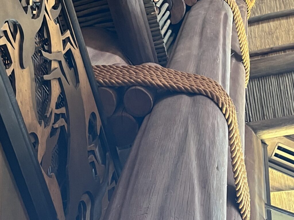 Once you are inside the main lobby at Jambo House, locate the columns and look at the three logs tied together near the base. Together, they form an upside-down hidden Mickey.