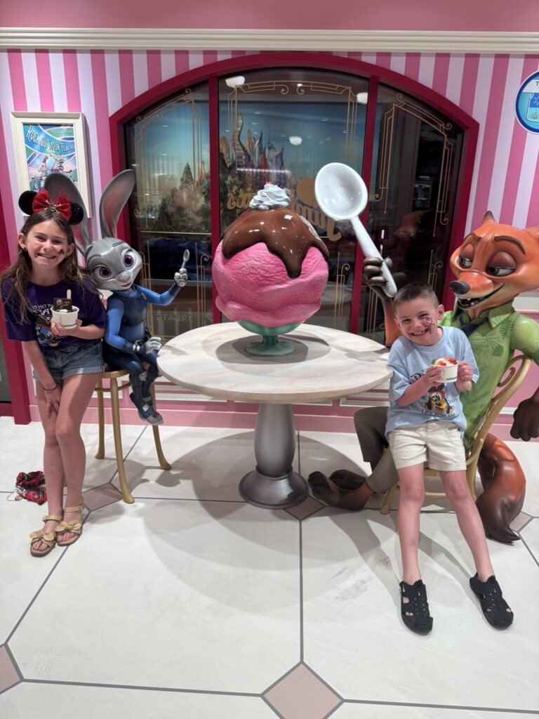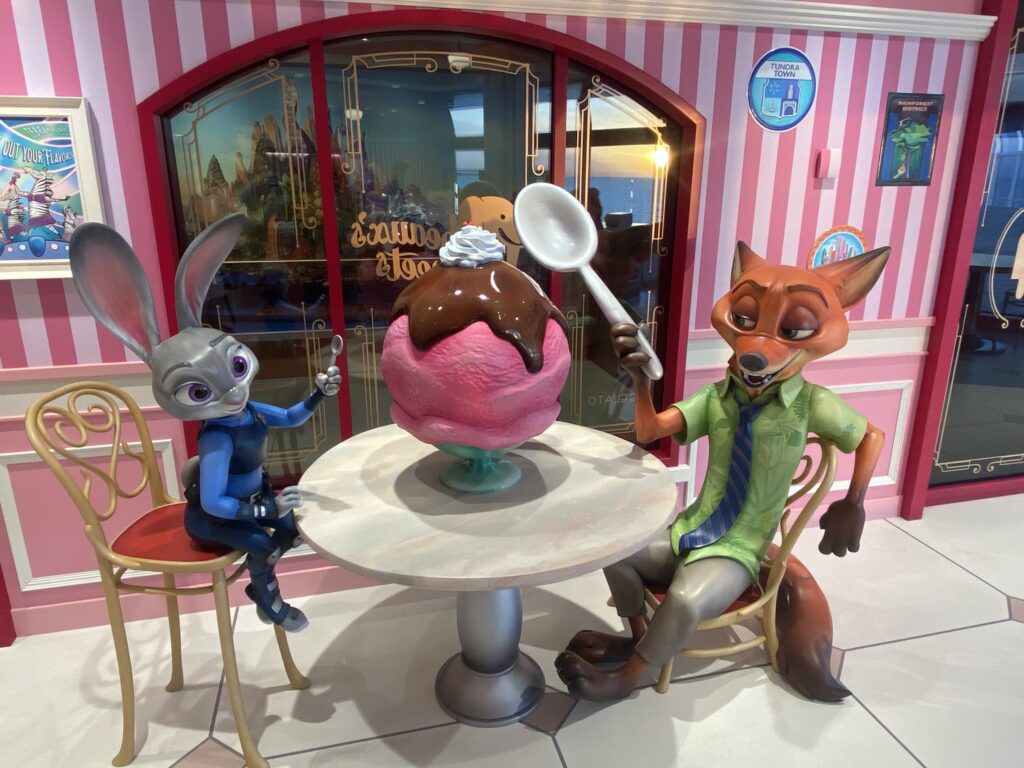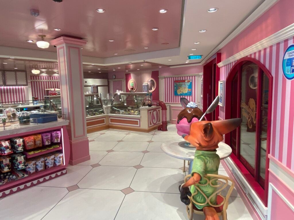 When our family sailed on the Disney Treasure, one of the first places we wanted to check out was Jumbeaux’s Sweets dessert shop! If you’ve seen Zootopia, you’ll recognize the name from the oversized ice cream shop in Tundratown.