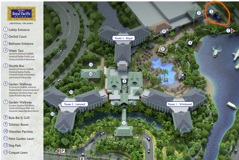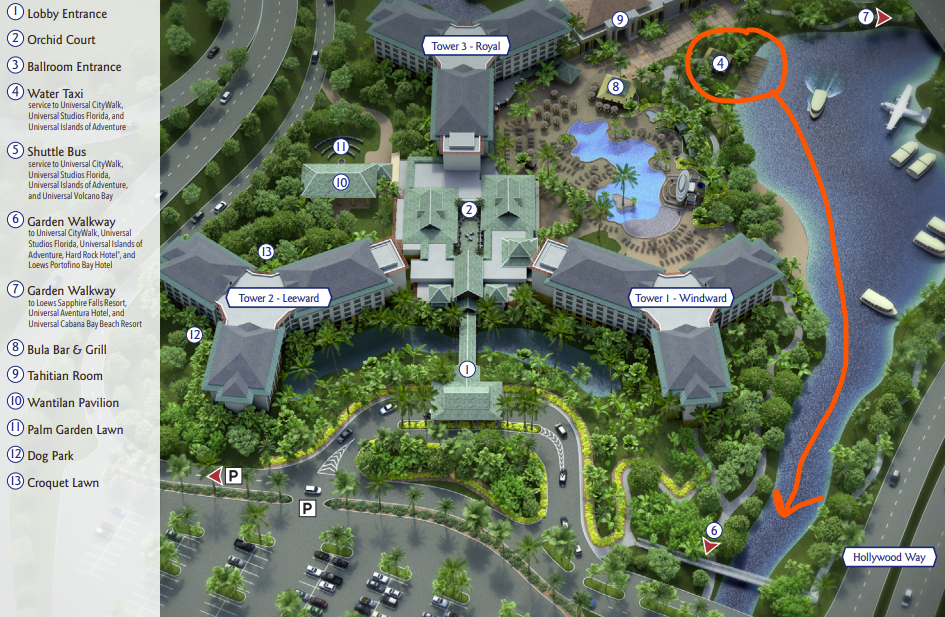 In the map below, I drew a red circle around where you will find the water taxis at Royal Pacific. The red line and arrow is the path the boat will take to the drop-off dock in CityWalk.