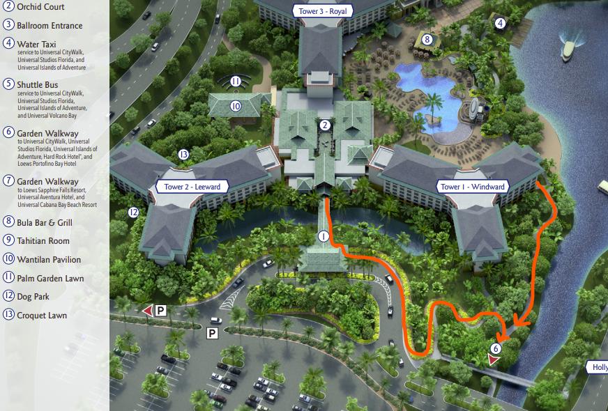Here is a map of Royal Pacific. The red line shows how to start walking the path towards CityWalk, Islands of Adventure, and Universal Studios.
