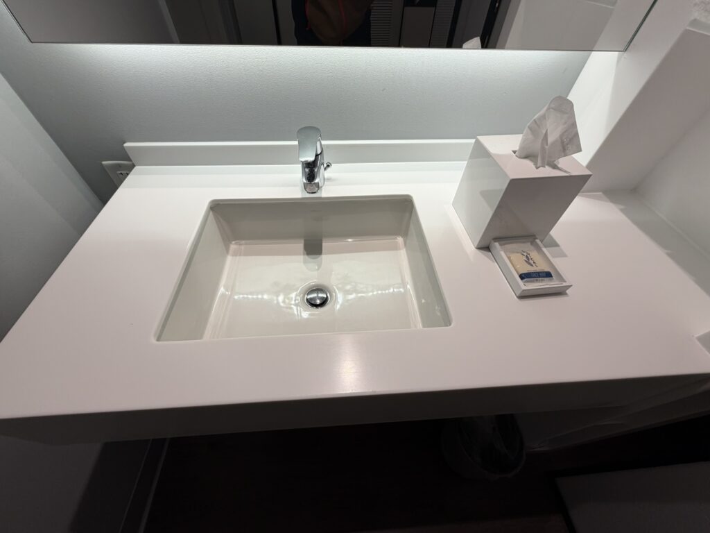 An up close view of the sink, along with complimentary soap and facial tissue.
